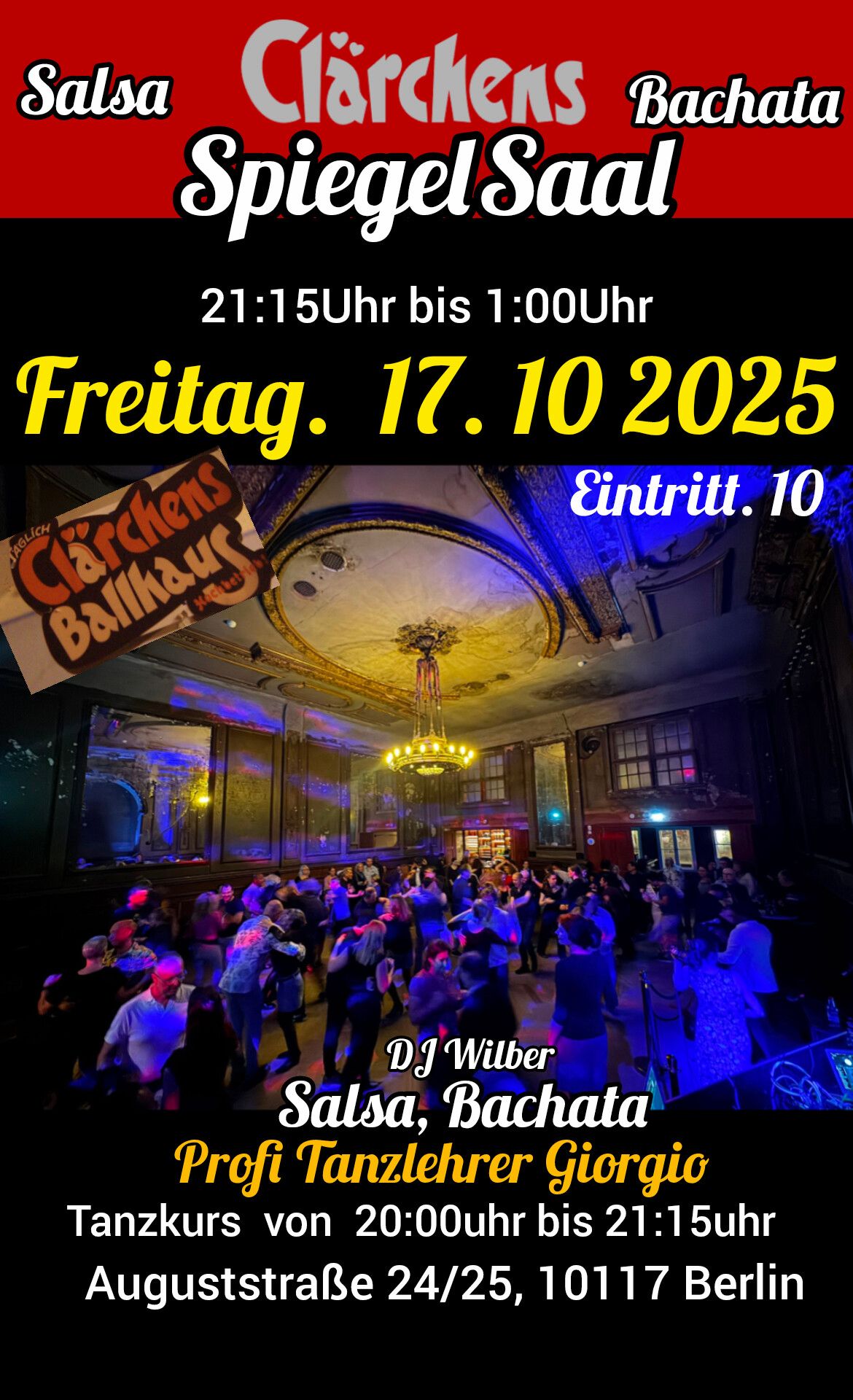 Lust auf Tanzen? Komm am Freitag, den 17. Oktober, ins Clärchens Ballhaus für einen Abend voller Salsa und Bachata.