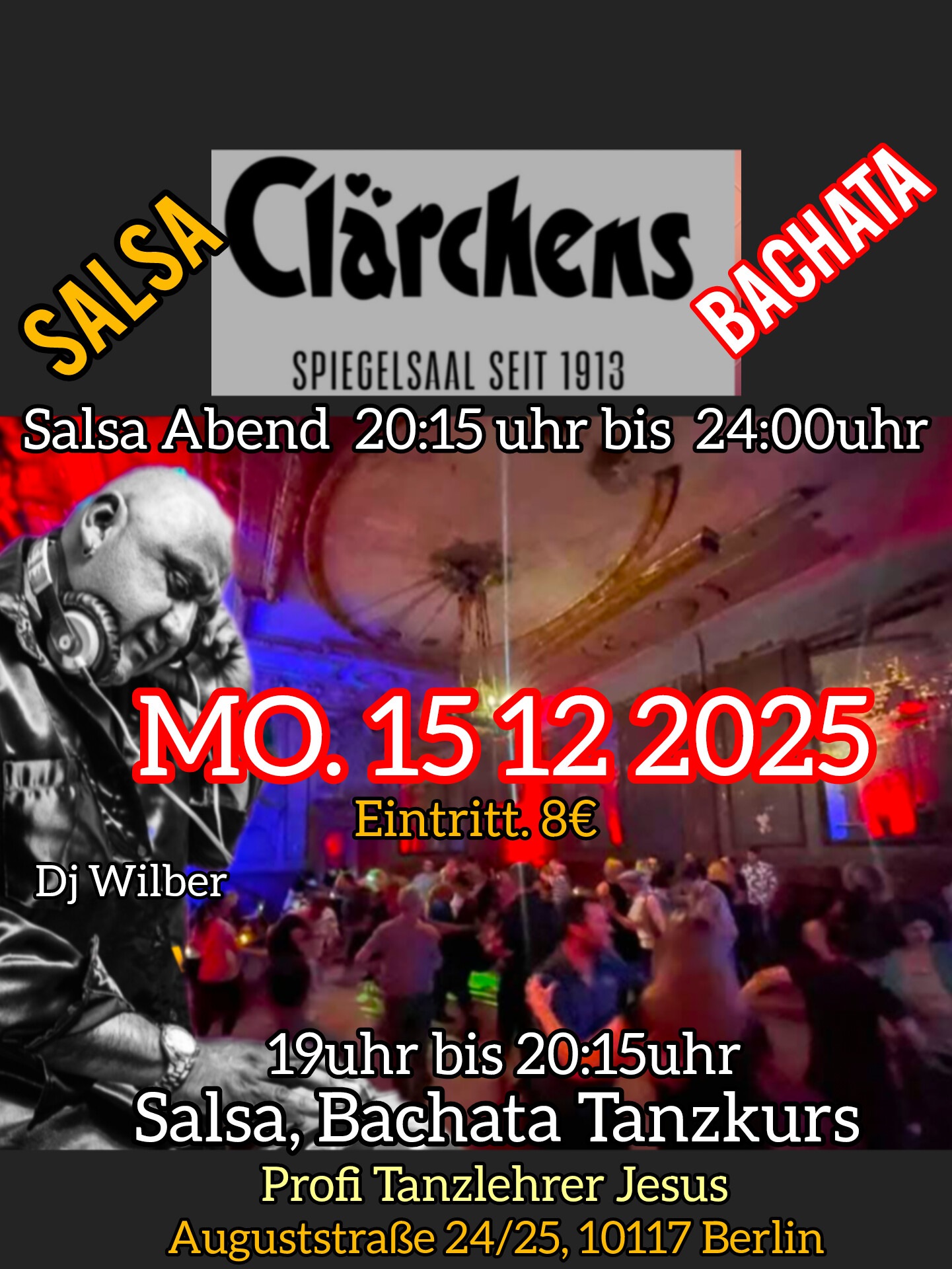 Lust auf Tanzen? Komm am Montag, den 15. Dezember, ins Clärchens Ballhaus für einen Abend voller Salsa und Bachata.
